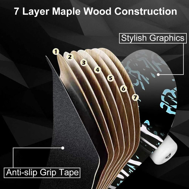 طول:79 سانتیمتر. عرض:20 سانتیمتر. جنس تخته: چوب 7 لایه. قابلیت تحمل وزن تا ۵۰ کیلوگرم. تخته با گریپ ضد لغزش. بوشینگ ها ثابت. اسکیت برد.